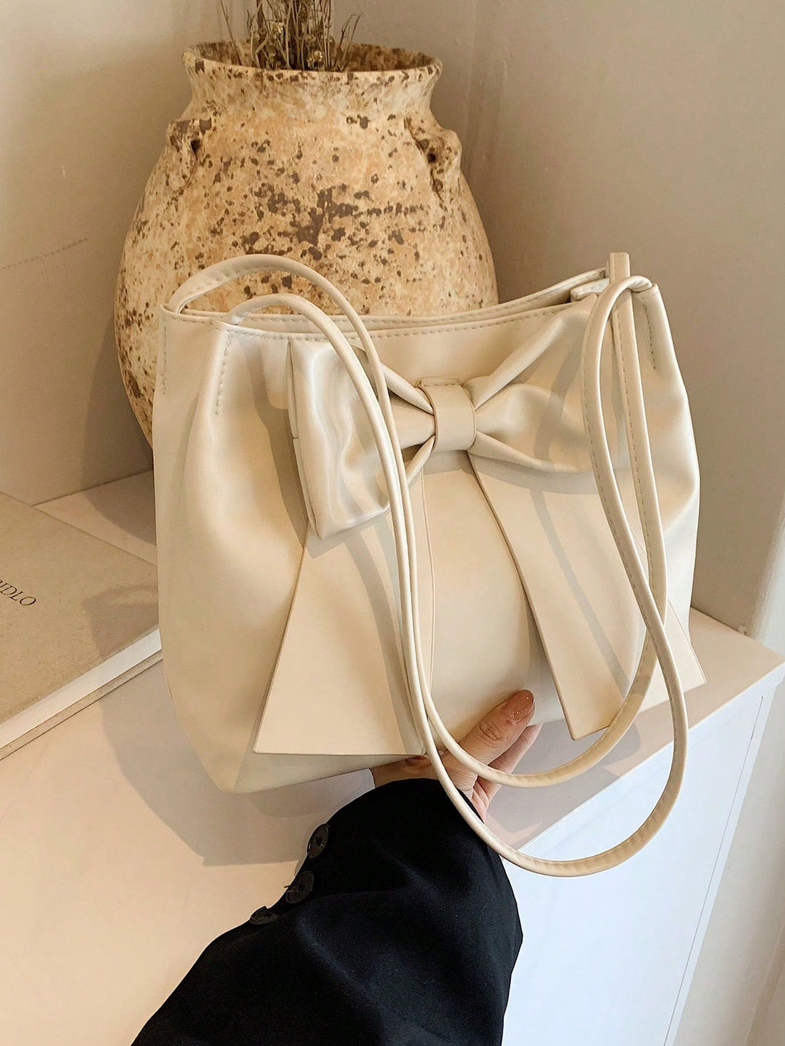 Solid Color PU Leather Shoulder Bag For Women, Ultra-Lightweight And Portable, Fashionable With Bow Decoration, Elegant Girls' Handbag