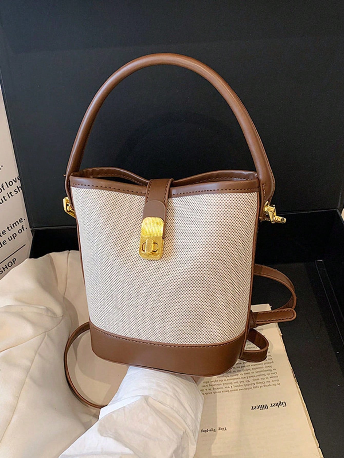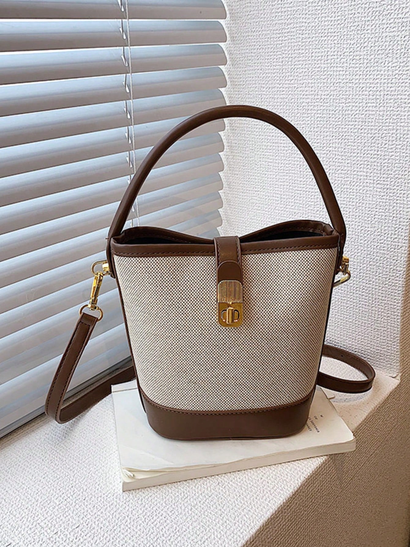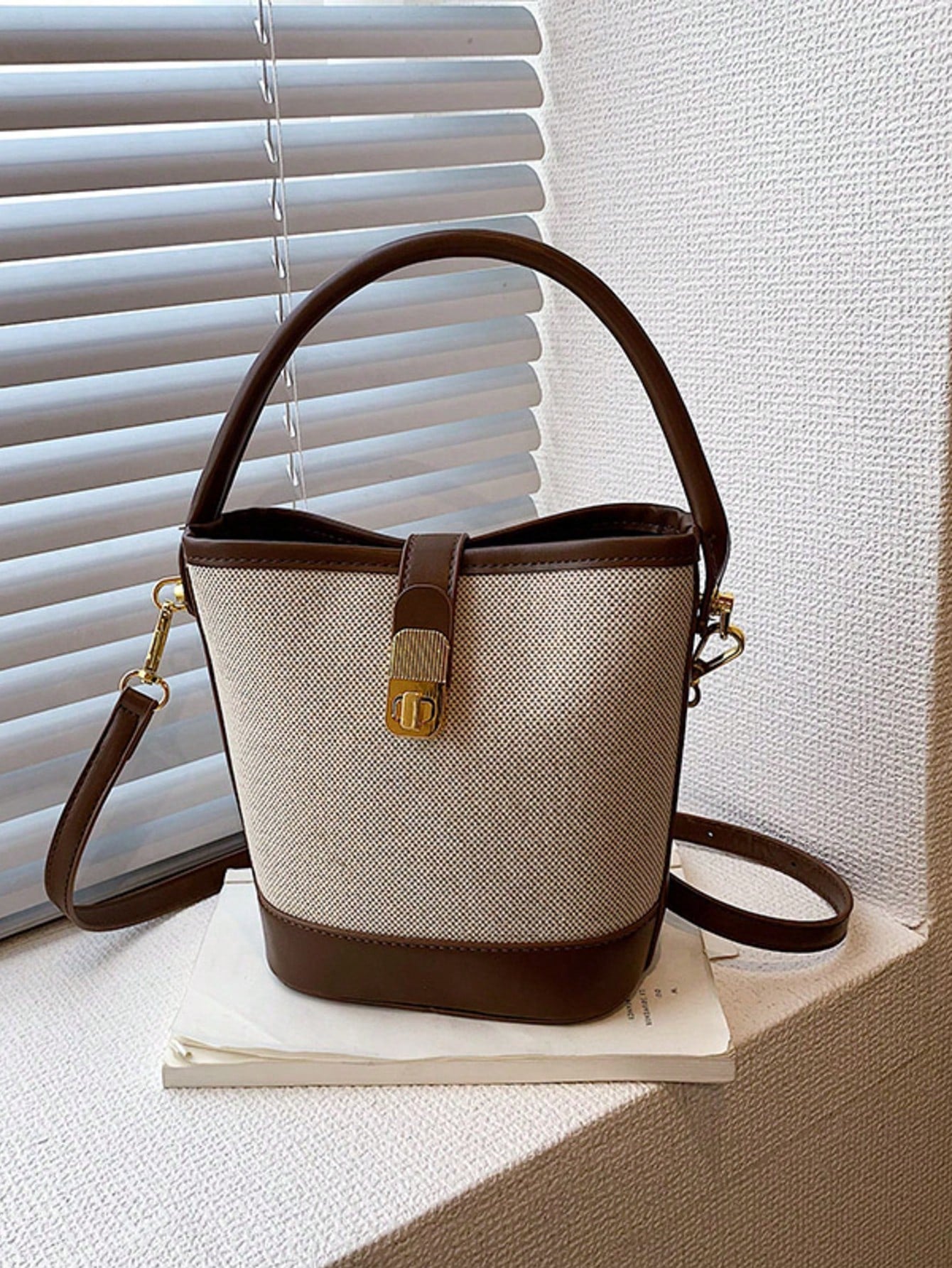 1pc Fashion Contrast Color Canvas Patchwork Bucket Bag With Adjustable Shoulder Strap