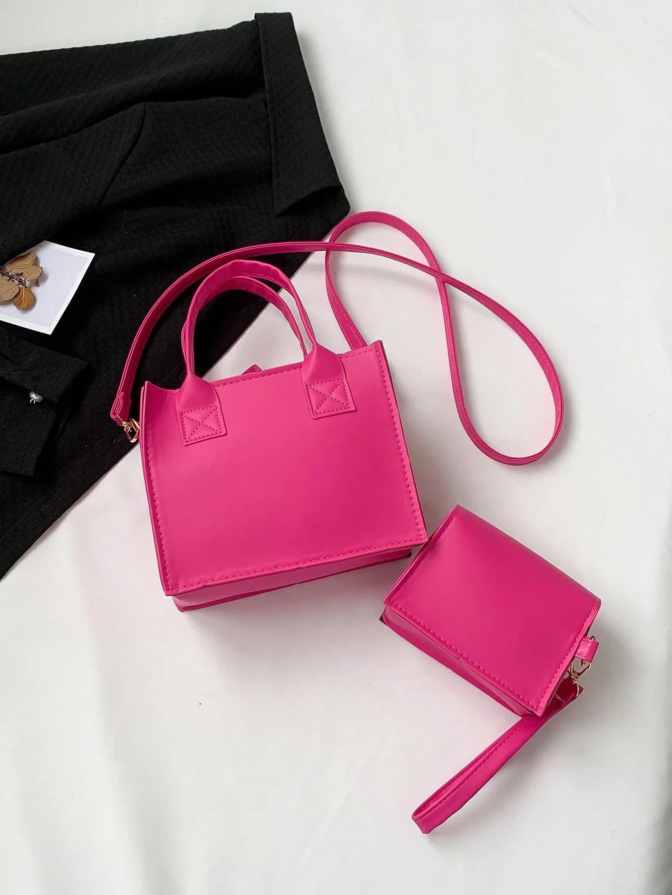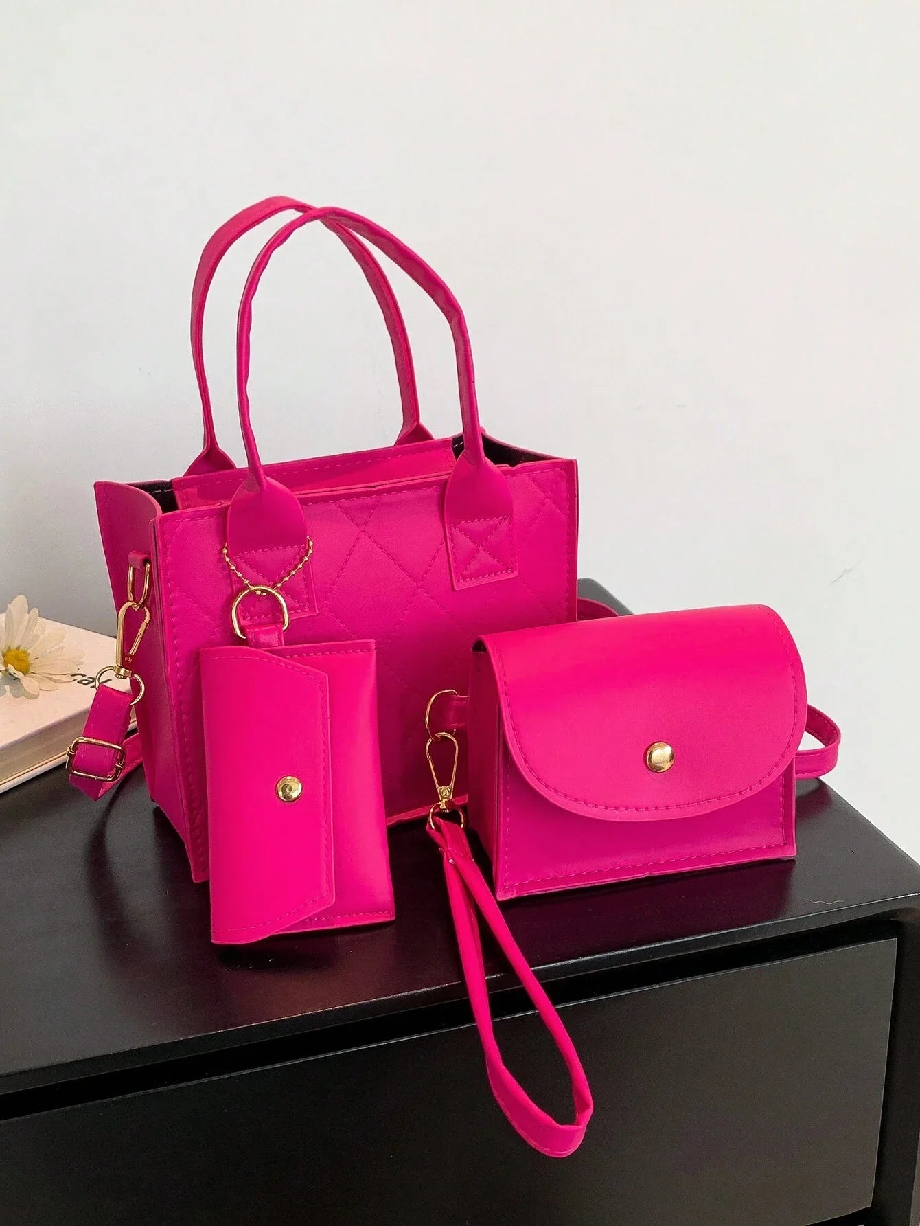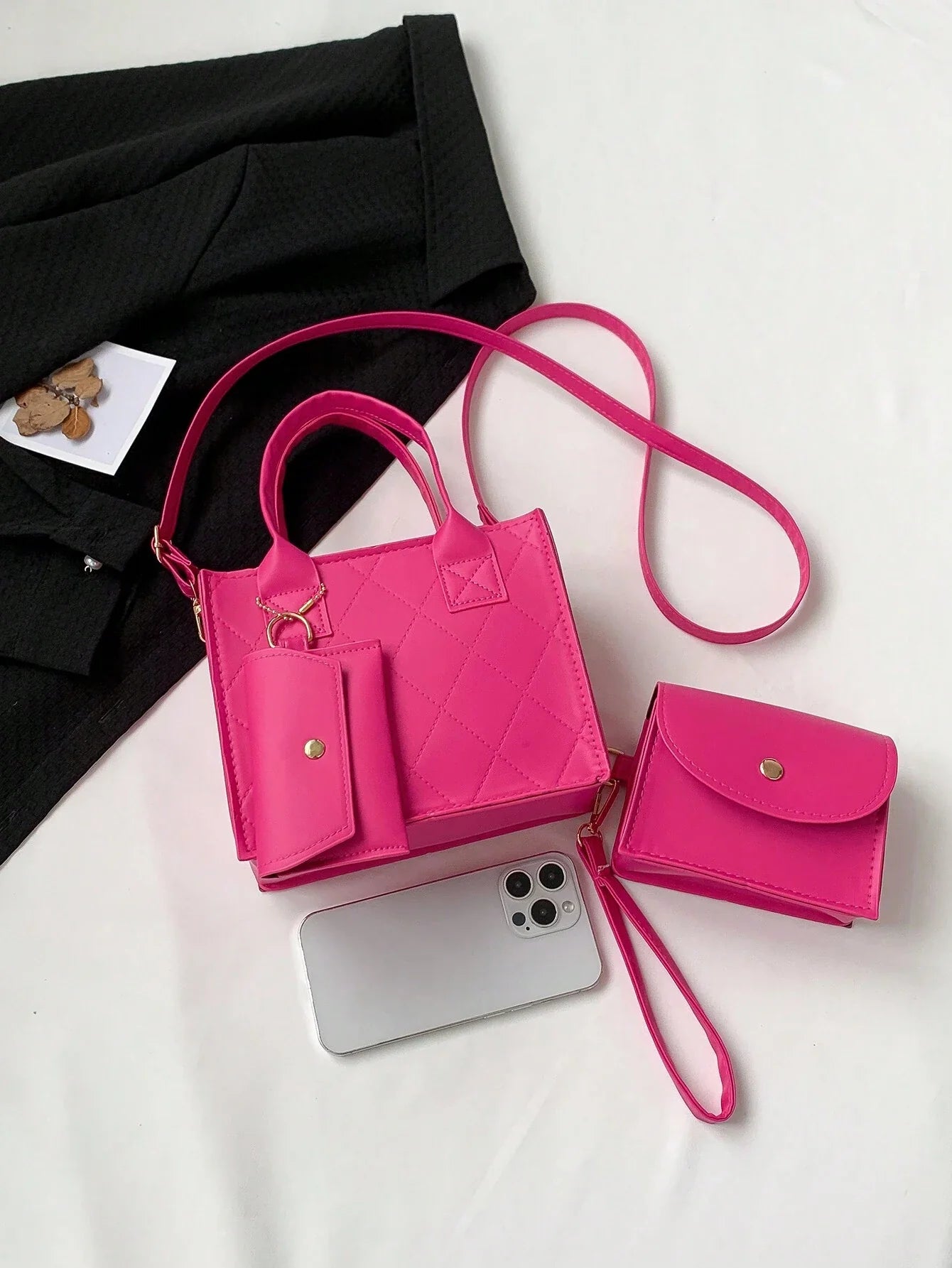 3pcs Set: Mini Solid Color Argyle Embossed Square Bags, PU Leather Dual Handle Adjustable Shoulder Strap Crossbody Bag, Wristlet Pouch, Zipper Wallet, Fashion Women Multi-Purpose Daily/School/Work Bag