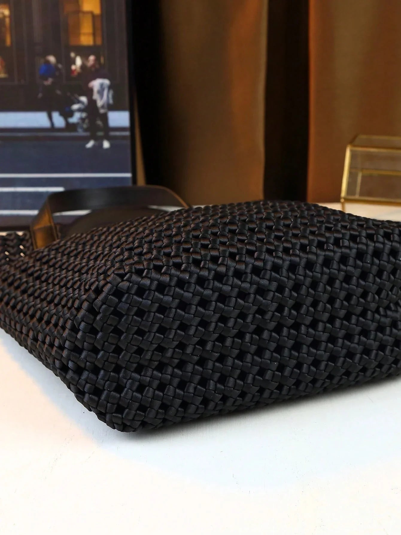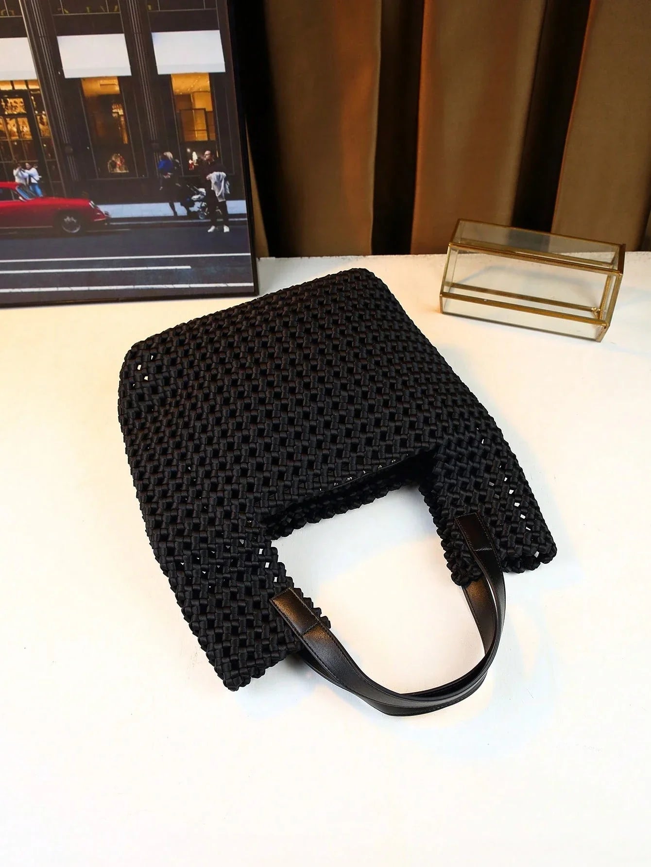 High-End Woven Shoulder Bag, Designer Large Capacity Tote Bag With Letter Design, Hollow Basket Style Handbag For Fashionable Commuting And Travel