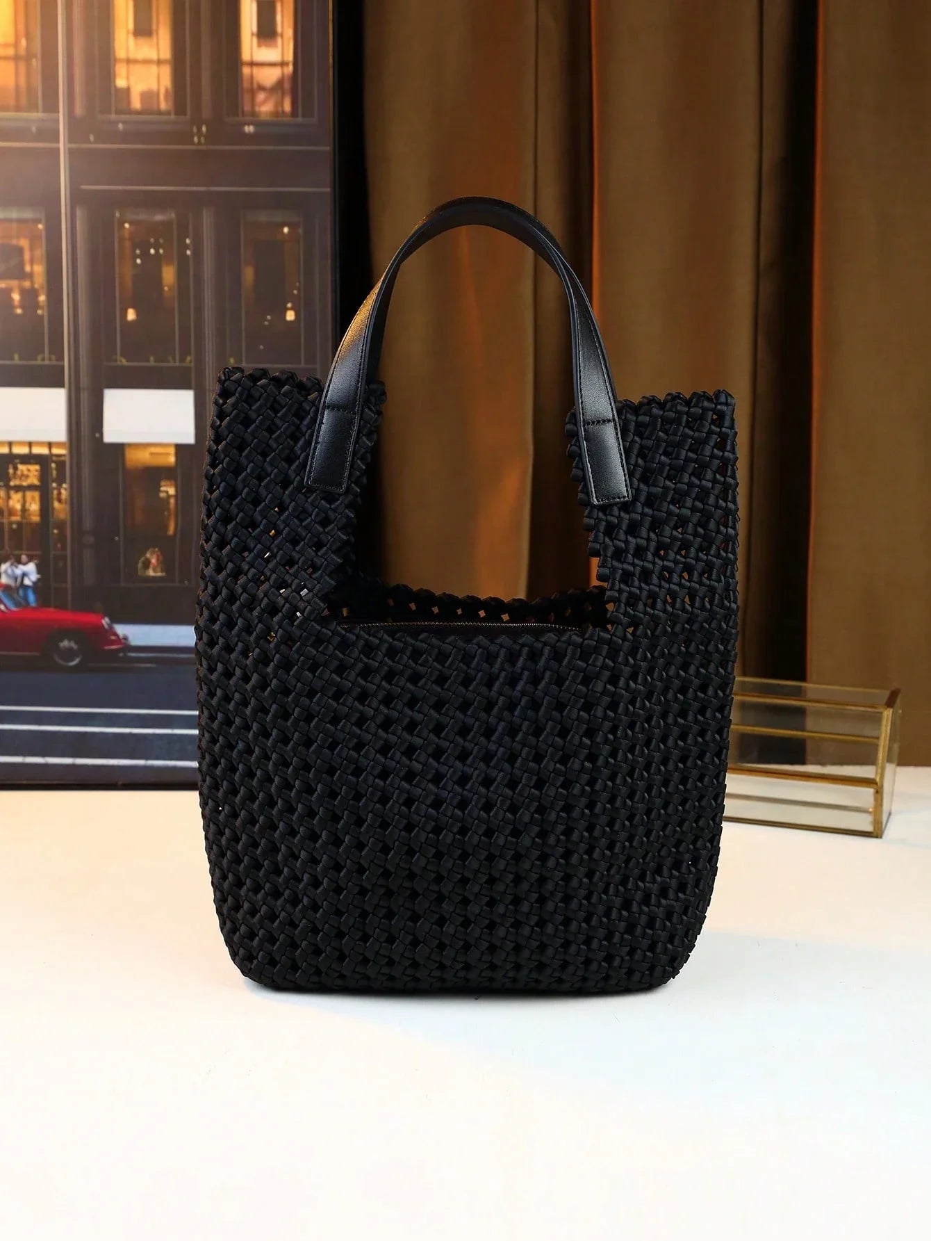 Elevate your everyday carry with our Designer Woven Tote, blending artisanal basket-weave detailing with high-end practicality. This spacious statement piece features a bold monogram design and innovative hollow construction, offering both breathable organization and runway-ready appeal.