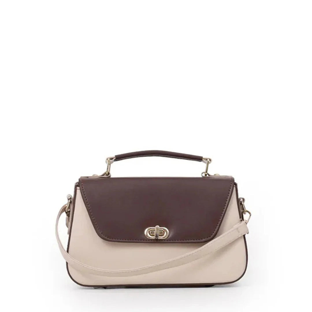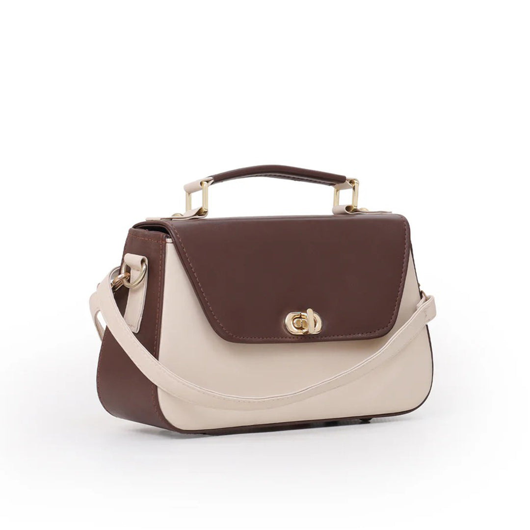This two-tone handbag blends rich choco with soft beige and gold accents for a look of understated luxury. Its structured silhouette and flawless finish bring elegance to every detail. Whether carried by the handle or worn crossbody, it defines modern grace with effortless charm.