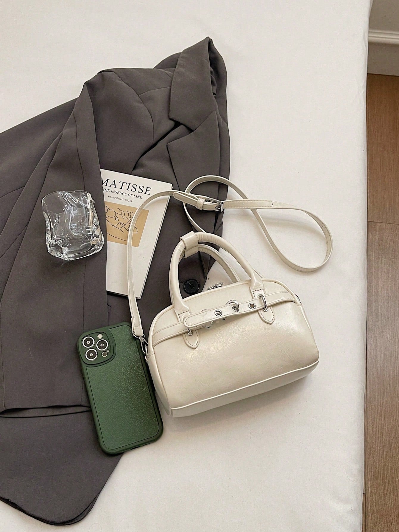 Embrace a stylish throwback with this retro bowling style handbag, a must-have for any fashion-forward woman. The unique design features a chic knot detail on the strap, adding a trendy and modern touch. Crafted for casual and versatile use, this bag can be carried as a handbag or a crossbody bag for hands-free convenience. It also comes with a small phone and coin pouch to keep your essentials organized. The beige color adds a neutral and elegant touch, making it a perfect match for any outfit.